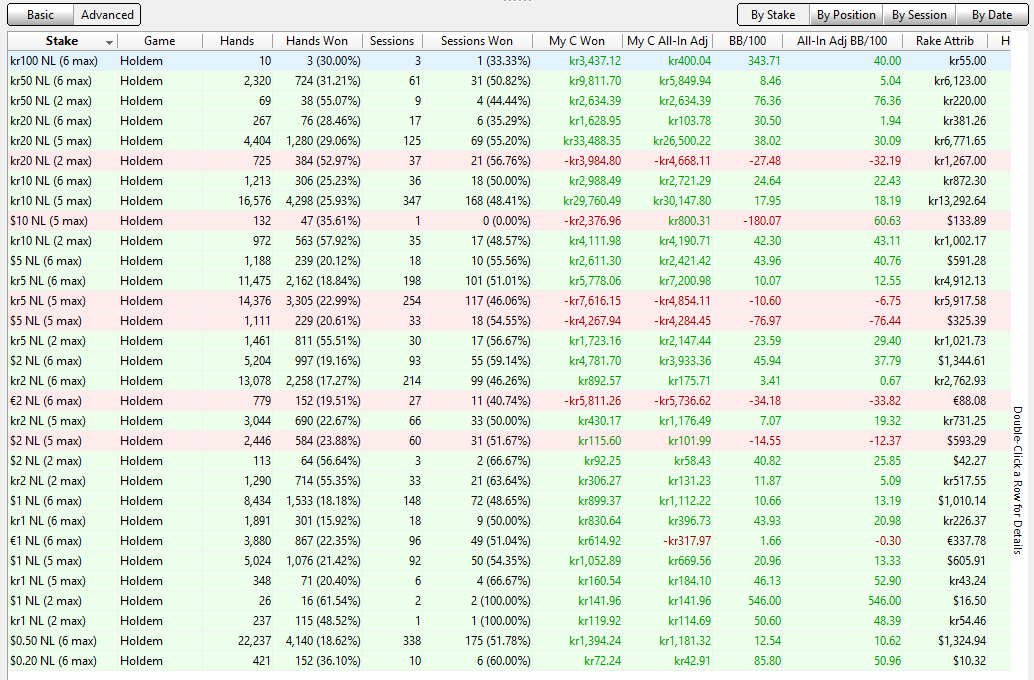 Första månadssummeringen för 2026 kommer här! Kul att komma tillbaka till pokern igen, och oj vilken rolig månad det har varit! Har struntat fullständigt i BRM eftersom jag bara spelar på en hobbynivå och har därför skottat både /50 och /100 så fort det har rullat bra games där. Det hade jag aldrig trott när jag börade för tre veckor sedan och satt och gnetade /2 och /5 Resultaten har varit varierande men är ändå väldigt nöjd med månadens resultat och volym. Inte lika nöjd med min bb/100 så det ska jag nog försöka fokusera på kommande månad för att försöka förbättra den. Ska försöka hålla i detta nu så får vi se hur länge hyperintresset håller i sig hehe Staksen med $ är spelade på min gamla dator där $ är satt som valuta i PT4 och sedan importerade över hit och ändrade till sek på en 1:1 kurs.6 poäng