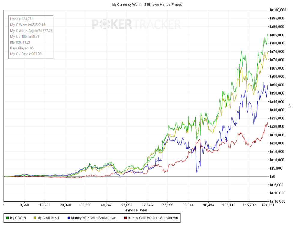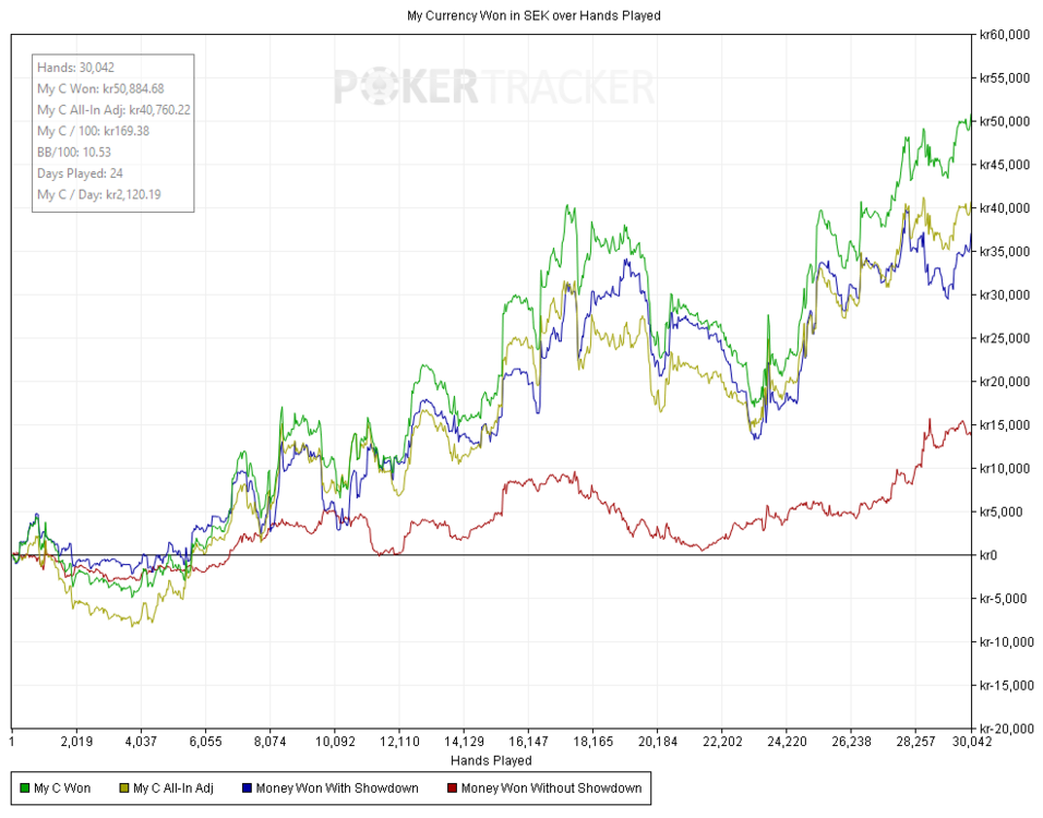 29'000 kr extra för en "hobbyspelare" är inte fy skam! Barnet får mat även i februari! 😉 Även volym på 50k händer är imponerande, många proffs som inte spelar den volymen.2 poäng
