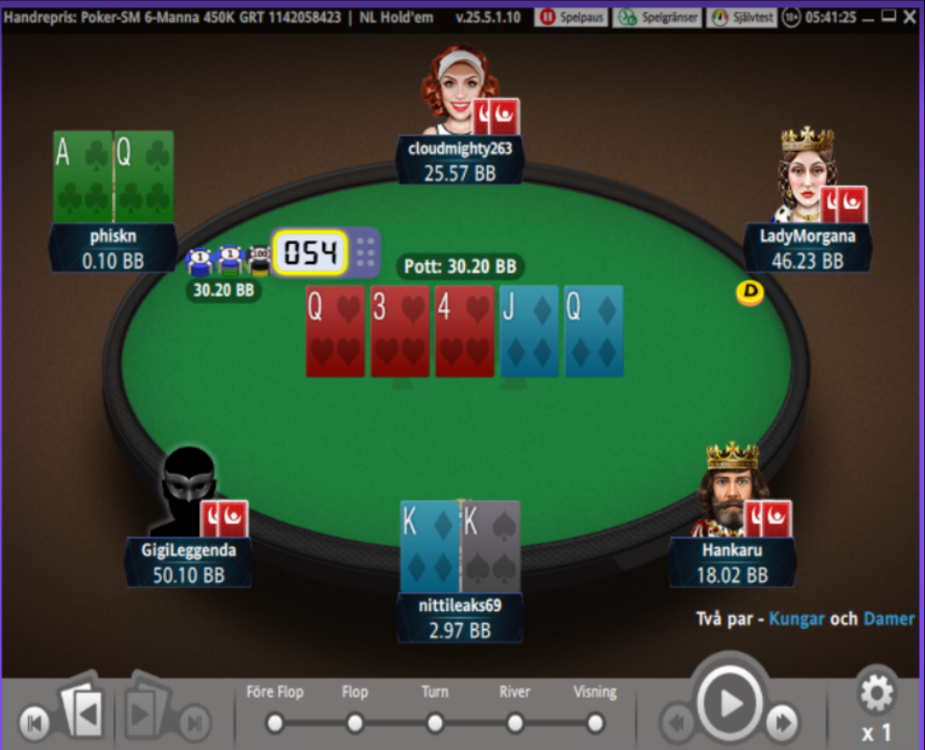 6 man sm Den här handen tog hela min stack... blev 62 i sm och ut med pengar i handen iaf, hade bra flow i turren, 1.8k- 57 svar