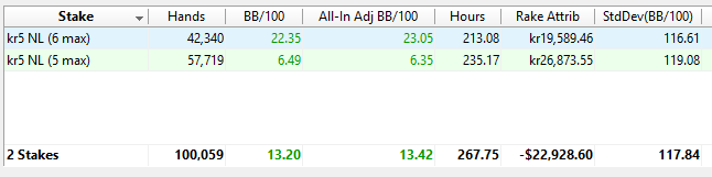 Tjenare alla Pokerforumare! Fiskpinnen är tillbaka efter lång paus! Så vad har hänt sedan sist? Började plugga till ett femårsprogram efter att ha insett att min gamla utbildning inte var vad jag ville göra med livet, och under den här tiden bestämde jag mig för att testa dryga ut SCN med lite poker. När jag skulle sätta in pengar på SvS insåg jag samma som många här redan varit med om: "Maxgräns på 1k insättning veckan". Fan. Efter att ha skottat 0.5/1 och 1/2 på liten rulle lyckades jag till slut så upp mig, ha jävligt flyt och ta hem Söndags Steken en söndag och har nu en bankrulle jag är bekväm med för 2.5/5 där jag spelar 90% av min volym. Jag vill även delvis återuppta skriva den här bloggen igen för att jag ser en del som skriver här på forumet i stil med att "gamet på SvS är dött" och "allt var bättre förr". Det kanske delvis stämmer, men om jag som kan plugga ett heltidsprogram och spela poker på deltid kan åstakomma nedan resultat så är gamet inte dött. Det går fortfarande att vinna bra pengar, och hade jag varit heltidsspelare så hade jag hellre lirat 2.5/5 SEK på SvS med 14bb/100 än att spela $1/2 på en annan site med 3.5 bb/100. Varansen är betydligt mindre och kvaliteten på spelarna på SvS markant sämre. Så jag hoppas mina resultat och den här bloggen kan vara lite av ett hopp för er andra som spelar! Resultat på 2.5/5 so far: Har även lirat lite 5/10, kommer dela när jag har ett ordentligare sample ~100k händer även där! Baserat på min upplevelse så här långt är jag nöjd, men jag tror att >15bb/100 är görbart under nästa 100k händer. Varför tror jag det? 1. Välja bättre bord/tider att spela Efter att ha analyserat min data är det tydligt att det finns bättre och sämre tider för mig att spela på. Ovan sample är även ett där jag spelat för många bord, så framöver blir det mer fokus på table selection och samt vilka tider på dagen jag spelar. 2. Har koll på regs/fiskar Jag har nu koll på regs, lite av deras tendenser samt vilka spelare som är småfiskar och vilka valar som bara längtar efter att donera pengar. Detta gör livet enklare när jag inte måste spela på samma sätt mot alla spelare och "försöka spela GTO", va fan det nu är för något. Kommer uppdatera här när det händer något spännande, men resultat kommer jag nog mest dela när jag har relevanta samples. Hoppas ni alla har det så bra det går i novembermörkret!