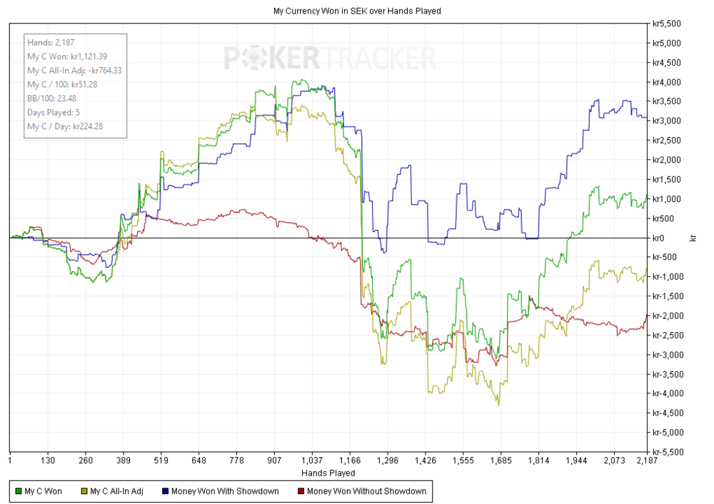 Vecka 17 Har gjort en liten smygcomeback på lägre stakes. Kännts bra förutom en session där jag spelade en fisk HU som sprang bättre än gud där jag gulade typ fem inköp. Har i slutet av veckan återupptagit ett hobbyprojekt som jag påbörjade förra sommaren där jag på egen hand bygger en hemsida där man kan spela olika klassiska spel och har en Elo-rating baserat på hur mycket man vinner/förlorar. De spelen som jag hann bygga förra sommaren innan det intresset svalnade var Sten-sax-påse, Fyra i rad, Kinaschack, Pentago och Sänka skepp. Tänker att jag ska finslipa lite mer saker på sidan innan jag kanske väljer att dela den här i dagboken om det skulle finnas något intresse för att kika på den :). Tyvärr så går ju det återuppväckta intresset för hemsidan direkt ut över pokerspelandet, så vi får se hur mycket lir det blir till veckan.