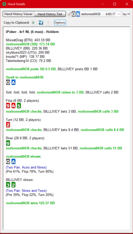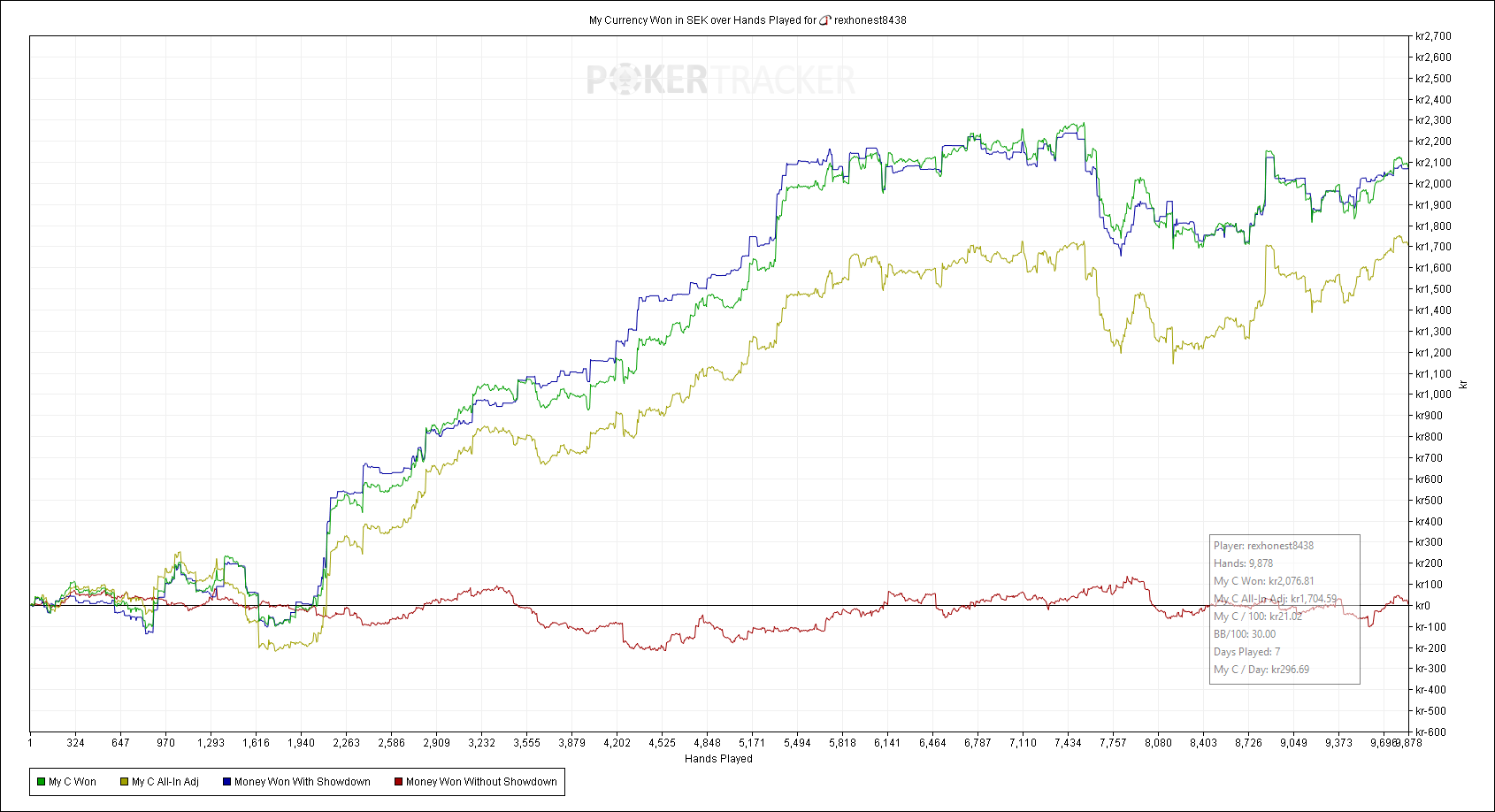 Kör en veckogiraff! Vill spela mer, men måste fan upp apkuktidigt. Jag kan inte klaga på springet i alla fall. Spelat ~16 timmar. Finns, såklart, utrymme för förbättring. Igår natt blev jag för synfiskig. Typ tiltsynade. När jag går från plöss till minus eller b/e, så har jag lätt för att tappa balansen typ. Får försöka vara mer vaksam på det, eller bara kliva. Hade kunna räddat några bajs in där. Måste lägga upp denna handen, av nostalgiska anledningar. Som på den gamla goda tiden! Mena inte att retas, kamrat Bill, i alla fall inte den här gången, du är mycket bättre nu.