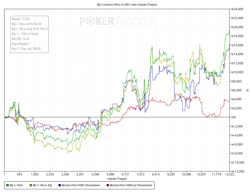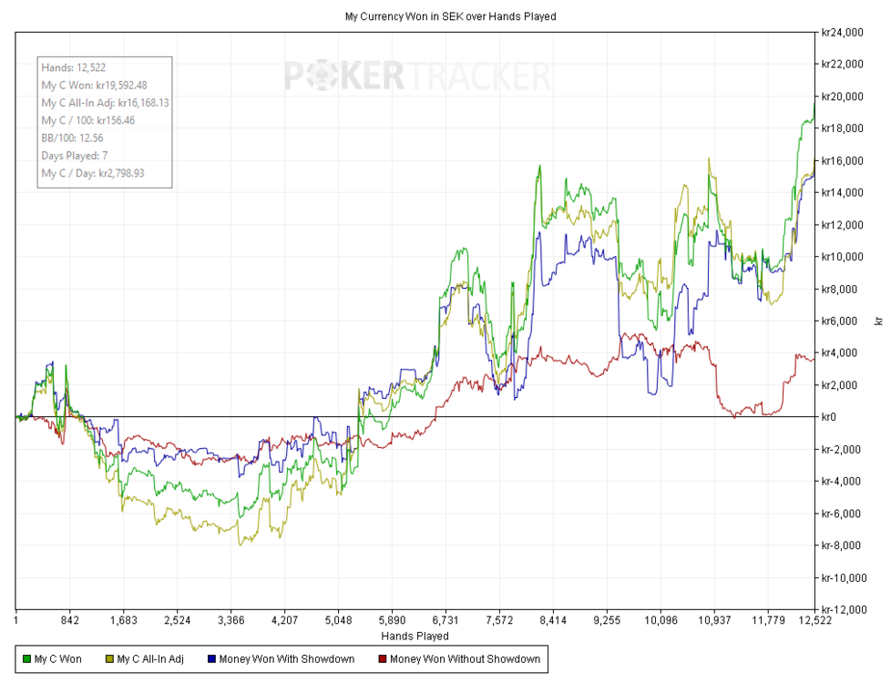 Veckosummering för första veckan i februari! Vi bokar ett väldigt fint plus efter en väldigt svingig vecka. Plus 8~k idag söndag under dagtid kändes oväntat men väldigt trevligt! Bara att fortsätta på inslagen väg, tänker jag. Börjar känna mig mer och mer bekväm på de högre nivåerna på svs (i och med att rullen stiger så man "snart" har en klok BRM). Har dessutom pratat med min gamla coach/staker från innan jag tog en paus från pokern 2021 under veckan, men vi båda kom gemensamt fram till att ingen av oss var i en speciellt gynsam position för att en ny liknande deal skulle vara profitabe lför någon av oss. Jag är dock öppen för förslag om det finns någon annan som skulle vilja ta ett litet snack om möjligheter kring mitt pokerspelande och en eventuell coaching/staking-deal. Mina DMs är öppna Tack och bock tills vidare!
