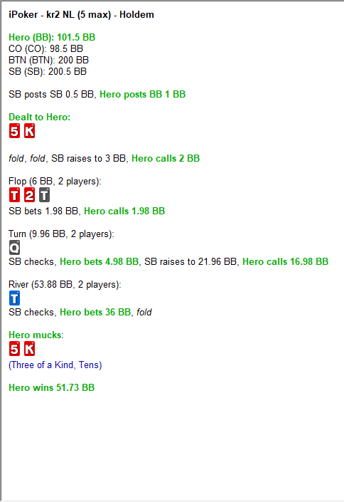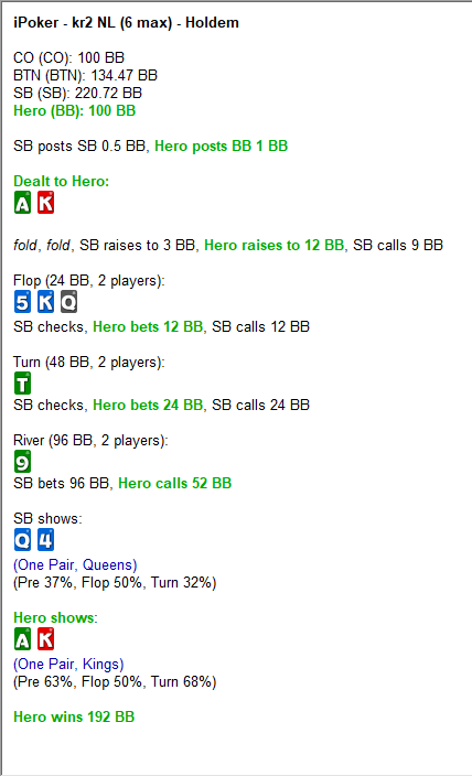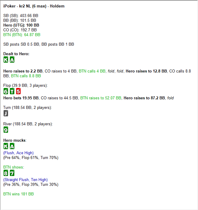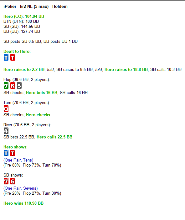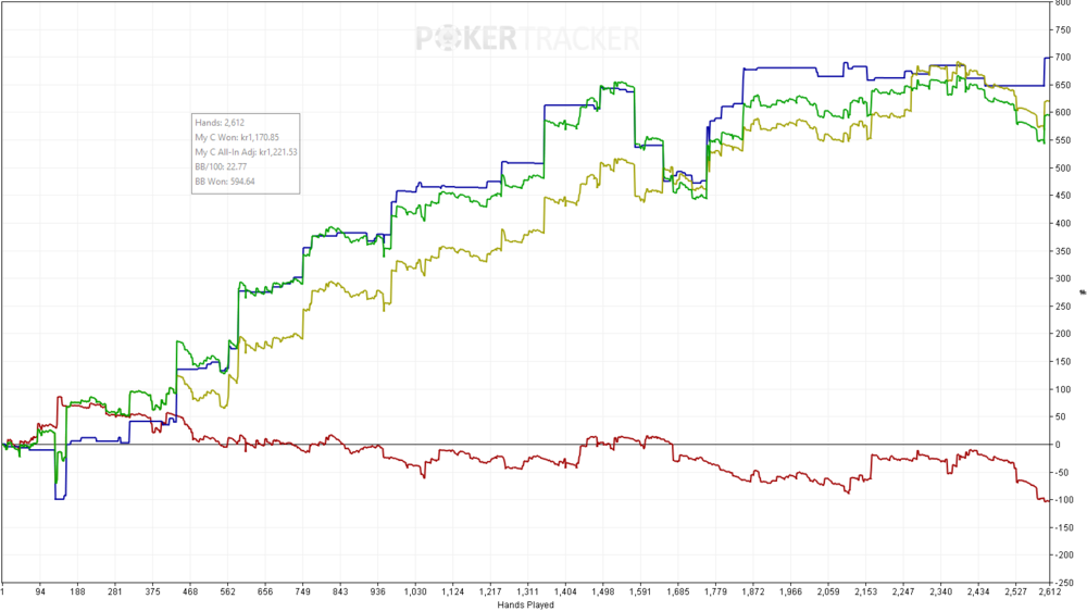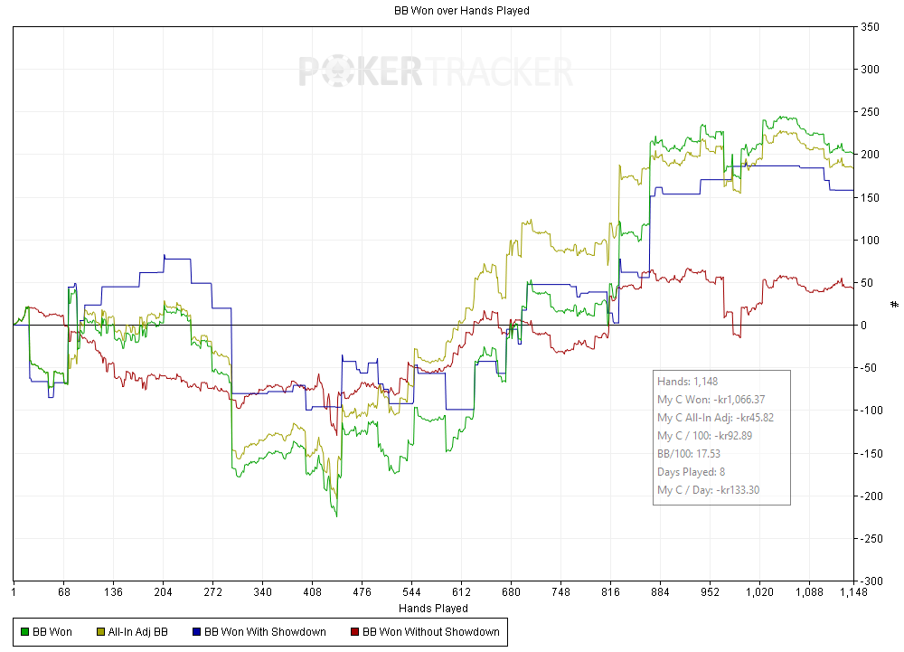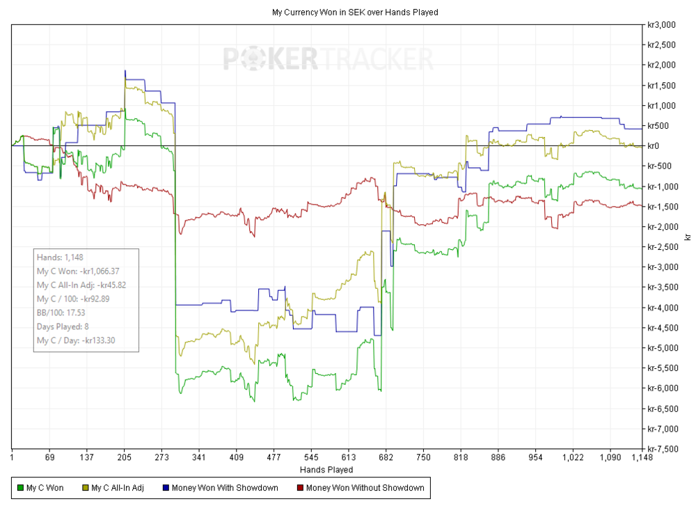 Bara spelat två timmar och 31 minuter idag, men fått till ett fint lidet plöss igen. Känns som jag börjat få lite momentum igen nu. Borde kanske spela mer, men måste upp så jävla tidigt imorgon, är mer värt att ta en promenad och lägga sig i tid. Har 2K i BR igen, men vet inte om jag kommer våga gå upp till /1. Kommer spendera en del pengar i helgen liksom. Har lagt ut några av mina dyrbaraste skivor på Tradera, så om jag får de sålda, kanske jag kan testa /1 ändå. Giraffen för idag ser ut såhär: Månadsgiraffen är ändå sjukt usel. Näst sämsta månaden på det senaste året. :/ Aja, är ju inte slut än, hinner kanske få in några fler inköp. Här kommer några stora potter. Trodde fan att jag skulle förlora denna hand: Antar att han bluffar där hah. Ingen aning om vad som pågår här, men FI tyckte kanske att min 1/3 såg svagt ut eller något? Puss på stjärten! 😘