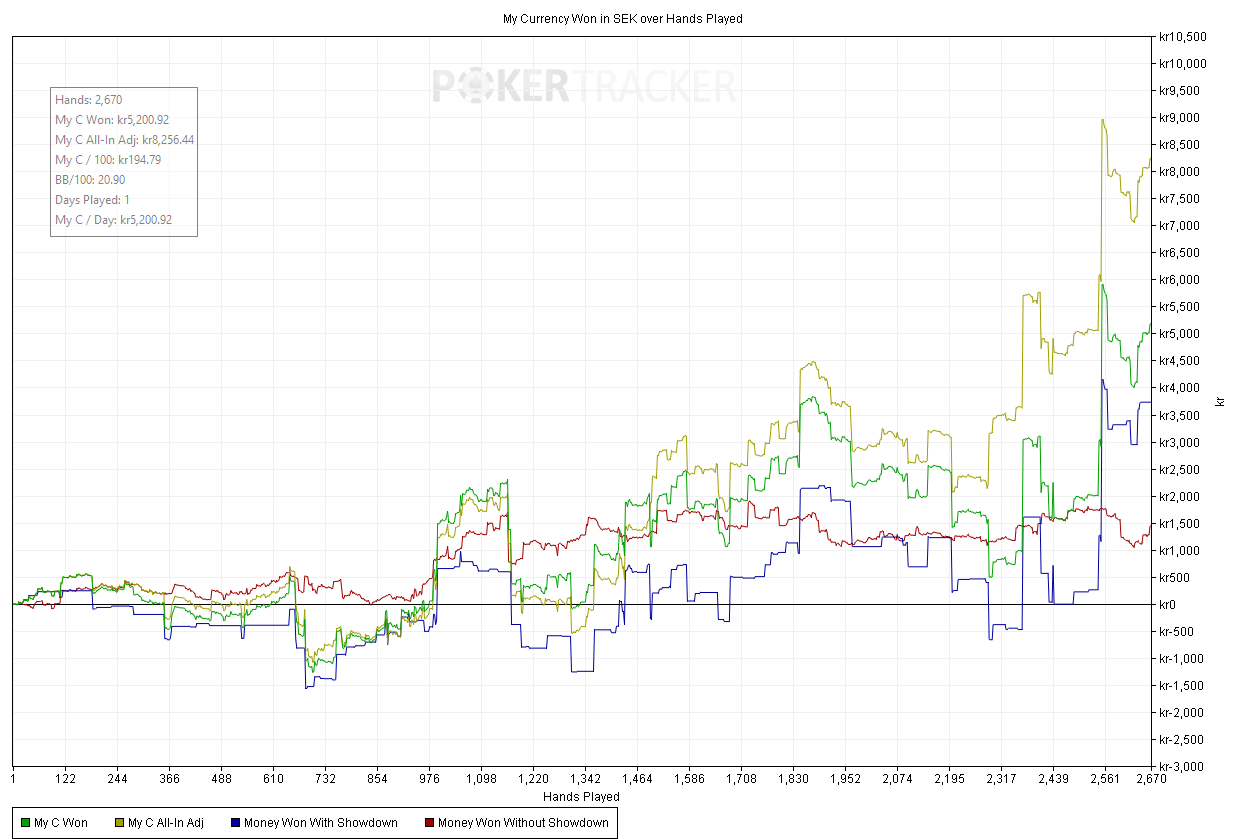 Stökig dag idag! Skönt att boka ett plus men mer lite mer run good (läs mindre run bad) så hade det blivit en galen dag. Tror jag stött på den sjukaste fisken jag någonsin sett idag på /10. Vi var ett gäng regs som satt med 500bb+ i stockarna och han bara dosade och dosade. Aldrig sett så spelberoende linjer förut som den snubben la.