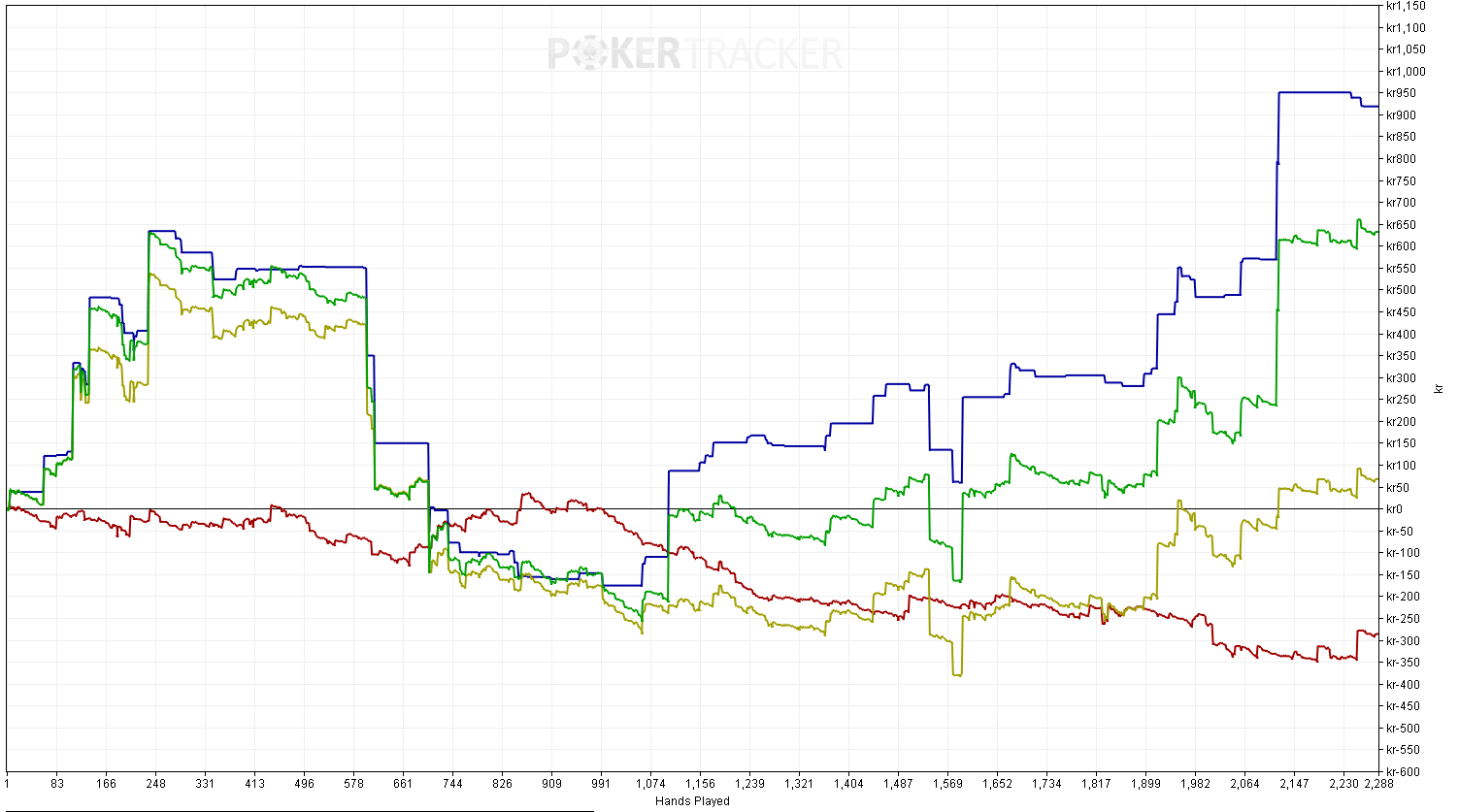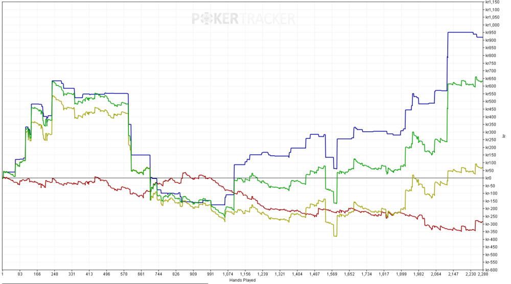 Vecka 15 Har varit en bra irl vecka, kommit igång med gymmet efter 3 år av lathet och träffat en vän igen som har varit och jobbat i Åre i 3 månader. Jag tog till mig det som @soldado9skrev och spelade hela veckan utan att glo på grafen. Kändes som spelet blev mycket bättre. Har du fler tips så får du mer än gärna skriva Funderar lite på att investera i en subscription på GTOWizard. Ni som har lite koll, vilken bör man köra? Kanske finns nån ny solver som jag inte hört om som är bättre? Tyvärr missat poker i helgen då jag var iväg med polaren på lördagen och jobbat övertid på söndagen. +632kr
