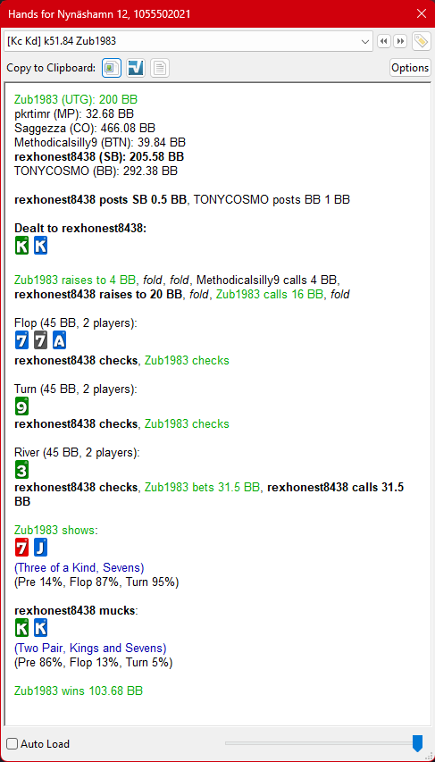 Svenska Spel – NL :0.25/0.50: kr (6 max) – Holdem Spelare: UTG (Hero): (67.39 kr) MP: (138.35 kr) CO: (15.05 kr) BTN: (15.05 kr) SB: (92.09 kr) BB: (52.51 kr) Posts: SB posts 0.25 kr BB posts 0.50 kr Hålkort: Hero: Preflop: SB : posts 0.25 kr BB : posts 0.50 kr Hero : raise 1.50 kr MP : fold CO : fold BTN : call 1.50 kr SB : call 1.25 kr BB : fold Flop (3 players) – Pot: 5 kr: SB : check Hero : bet 3.50 kr BTN : call 3.50 kr SB : call 3.50 kr Turn (3 players) – Pot: 15.50 kr: SB : check Hero : bet 11 kr BTN : fold SB : raise to 33.95 kr Hero : fold Result: SB wins 36 kr Rake: 1.50 kr Detta är mot en villain med 30 i VPIP, låg 3-bet, fold to c-bet på 68% och raise c-bet på 11% (330 händer). Villains höjning på turn indikerar för mig en stark signal. Jag tror inte att han slowplayar 99 och QQ på floppen på den brädan, och jag har svårt att se 88 finnas i rangen. JT skulle också kunna kännas sårbar mot två spelare. K8 (blockar), Q8, 89 ? -