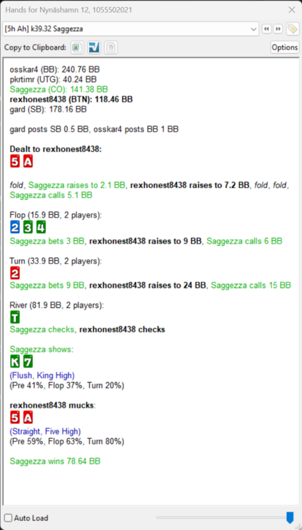 Jajo, tänkte ett tag på c/r ändå iom han stabade rätt lite, men njä, det är ju typ tvärtemot den ursprungliga tanken. Ja, det makes sense. Va helt övertygad att potten skulle komma till mig hah. Blev osäker på den för att jag ej spelade enligt min standardlinje.