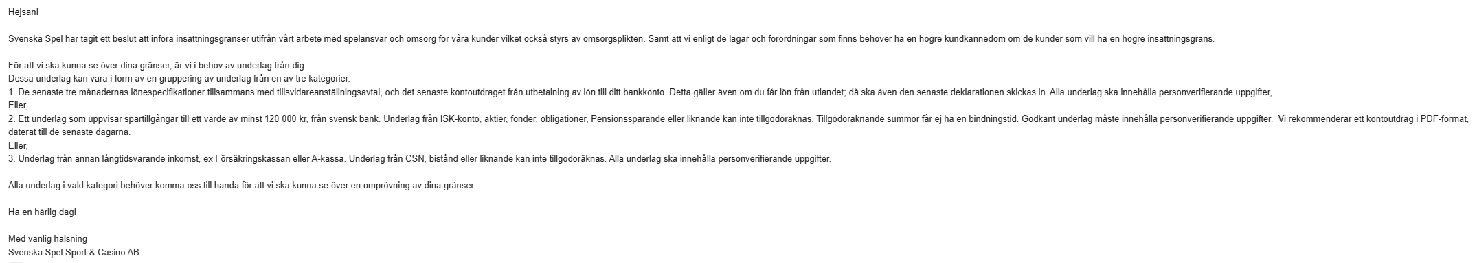 Är det någon annan som har fått kraftigt begränsad speltid? Jag fick det precis efter att ha blivit ombedd att göra ett ”självtest” på Svenska Spel. Jag svarade 0 på alla frågor, men tydligen ansågs det inte vara realistiskt. De sa också att de just nu granskar spelare, och att de som inte har gjort självtestet – eller som har svarat för lågt – riskerar avstängning eller kraftigt begränsad speltid. Så ett tips: gör självtestet och svara typ 4–7 på frågorna om ni inte vill riskera samma öde som jag.