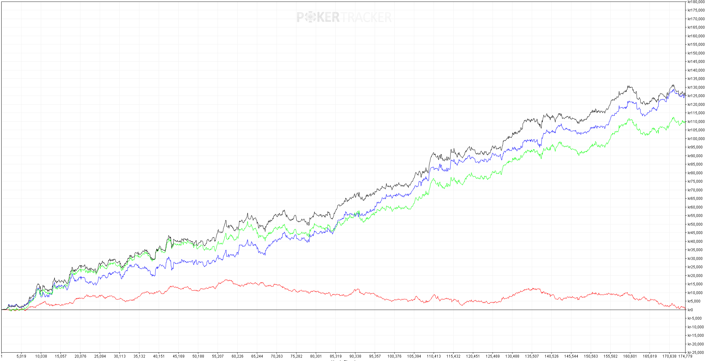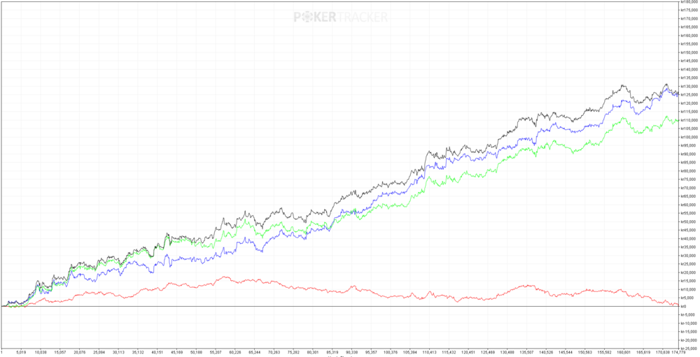 Tog faktiskt inte bort databasen. Valde att spara den och utgå därifrån datummässigt.. En bra reminder att ha ett totalras i grafen så att jag kan påminna mig om att jag är helt sämst när jag är sämst. Unibet för att motståndet på microstakes nästan är softare än SvS och jag föredrar nog 100bb bord före 200. Samt att efter alla dessa tiltsessions på SvS där jag plötsligt spelat highstakes och Euro och Varit helt jävla sanslös så satte SvS spärrar på mig. får bara spela 5h / dag vilket är för lite vissa dagar.