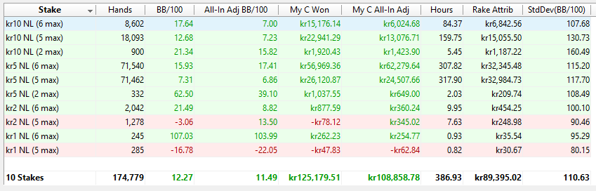 I mitten av april öppnade jag för första gången på ett par år mitt SvS konto, insåg att jag fått den magiska gränsen 1000 kr i månaden som insättningsgräns, drog ett frågande mail till kundservice och fick en knapp vecka senare ovan svar. Tilt. "Jävla idioter, jag ska fan jobba upp min rulle från 1k till 120k, skicka en screenshot och fråga om det räcker som bevis" tänkte jag samtidigt som jag knöt näven i fickan och påbörjade min resa. Ett par agressiva skott på 0.5/1 och 1/2 samt en klonk i Söndagssteken och flera månader senare är resultaten för året inne! 2025 Eftersom det är svårt att uppehålla tilt i 8+ månader (även om vissa här, undertecknad inkluderad, verkar göra tappra försök) har jag längst vägen tagit ut pengar och kan därför inte skicka printscreen till praktikant-killen på SvS, men om han läser detta så tack för motivationen! Jag har nu en bankrulle att bekvämt lira 2/5 samt 5/10 utan att oroa mig, och skulle allt skita sig kan jag alltid grinda 1/2 i en månad så borde det lösa sig. Så vad är mina lärdomar från 2025? Det kan sammanfattas rätt kort: kvalitet över kvantitet. Det låter jävligt enkelt och tråkigt, men jag har nu rätt god data på vart/när jag tjänar 15-20bb/100 och vart/när jag tjänar 5bb/100. Jag kommer dela mer om detta i bloggen längst året vi nu befinner oss i, i ett försök att ge tillbaka till er andra som är på väg upp i stakes. Stay tooned! 2026 Som avdankad SnG/MTT-reg från 2008-2011 eran som numera läser ett 5-årigt universitetsprogram är ovan resultat precis vad jag vill ha i mitt liv just nu. Låga stakes, hög win-rate och extra 20-30k i månaden från att göra något som fortfarande är relativt kul och har hög timlön på knappa 300 kr / timme i jämförelse med vad jag annars kan göra. Men jag är inte "på väg uppåt", utan är snarare i utfasning av pokern. Därför är mina mål med året inte att expandera, utan att minska, mängden jag spelar 2026. Mål 2026 * 500 högkvalitativa timmar spel * Win-rate på 15bb/100 EV * Skriva en strategi-post / månad tänkt att öka low stakes spelares win-rate Önskar alla er andra stort lycka till under året som kommer!