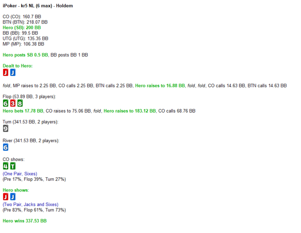 Så en bra vecka som nu går in i helgen. Spelat en bra bit över 10k händer på 25NL€ och det har gått mycket bra, Har helt lag ner resultatfokuset och inte ens kollat men är solklart på plussidan. Bara jobbat med fokus, tiltkontroll och pluggat läckor. Har hittat en riktigt ordentlig läcka som bytt skepnad. Förut var jag för feg och missade värde. Checkade tillbaks rivers osv för att jag var skraj för den där raisen som aldrig kommer. Nu istället har jag växlat över till aggression och övervärderar händer och bettar för stort när jag borde chilla och kontrollera potten. Ska lära mig folda och ta tid på mig i situationer. Vissa stunder är jag superfokuserad och tar hela timebanken för en pot på 7bb för att 5 minuter senare checkraise jamma på 2 sekunder med JJ i en 3bettad pott på flopen T 9 7. Men grym vecka, utvecklingen går snabbt nu. Något har klickat!