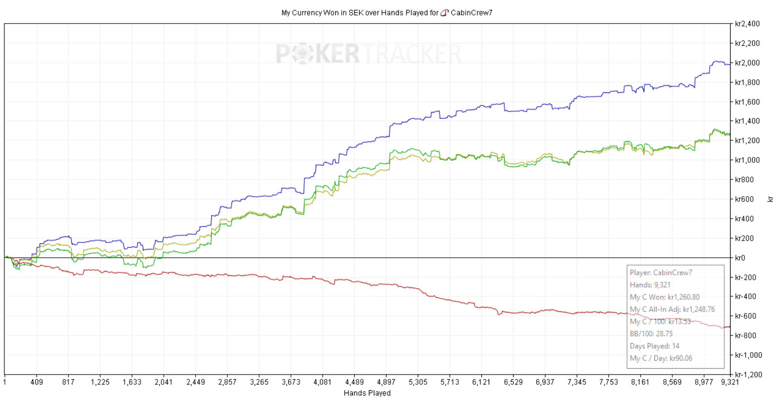Två förlusthänder Hand 1 Svenska Spel – NL 0.25/0.50 kr (6 max) – Holdem Spelare: SB: (19.04 kr) BB: (89.66 kr) UTG: (47.85 kr) CO: (102.79 kr) BTN (Hero): (116.25 kr) Posts: SB posts 0.25 kr BB posts 0.50 kr Hålkort: Hero: Preflop: UTG : raise 1 kr CO : fold BTN (Hero) : call 1 kr SB : call 0.75 kr BB : call 0.50 kr Flop (4 players) – Pot: 4 kr: SB : check BB : bet 1 kr UTG : call 1 kr BTN (Hero) : call 1 kr SB : fold Turn (3 players) – Pot: 7 kr: BB : bet 2.50 kr UTG : call 2.50 kr BTN (Hero) : raise 13.50 kr BB : call 11 kr UTG : fold River (2 players) – Pot: 36.50 kr: BB : bet 18 kr BTN (Hero) : raise 100.75 kr BB : all-in 56.16 kr Showdown: BB shows: BTN (Hero) mucks: Result: BB wins 179.82 kr with kåk (femmor över sjuor) Rake: 5 kr Board: Detta var mot en rec med 60 i VPIP. Hans femmor är väl bara stål, så jag borde väl inte värdehöja river? Hand 2 Svenska Spel – NL 0.25/0.50 kr (6 max) – Holdem Spelare: BTN: (24.82 kr) SB: (229.39 kr) BB: (48.13 kr) UTG: (8.10 kr) MP (Hero): (110.65 kr) CO: (216.72 kr) Posts: SB posts 0.25 kr BB posts 0.50 kr Hålkort: Hero: Preflop: UTG : call 0.50 kr MP (Hero) : raise 2 kr CO : fold BTN : fold SB : call 1.75 kr BB : call 1.50 kr UTG : raise 8.10 kr MP (Hero) : call 6.10 kr SB : call 6.10 kr BB : fold Flop (3 players) – Pot: 26.30 kr: SB : check MP (Hero) : bet 17 kr SB : call 17 kr Turn (2 players) – Pot: 60.30 kr: SB : check MP (Hero) : all-in 85.55 kr SB : call 85.55 kr River (2 players) – Pot: 231.40 kr: Showdown: MP (Hero) shows: SB shows: UTG mucks: Result: SB wins 226.40 kr with tvåpar (ess och tior) Rake: 5 kr Board: Detta var mot en liknande rec som synar light. Jag tror inte att denna är så mycket att orda om, mer än att det var enormt irriterande med mirakelkortet på river. -