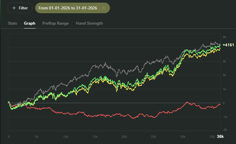 Så januari är slut och här kommer lite grafer! Nice upswing på slutet men fortfarande under den magiska 15bb/100 gränsen, i alla fall i EV. "Better be lucky than good" antar jag 😅. Överlag nöjd med månaden, då jag hittade lite mer tid att spela än jag räknat med. Jag tror den stora take-awayn från januari är att jag lätt faller in i att spela något bord för mycket, som någon @KlonkSteve så snyggt kommenterade på är detta ett recept för att förlora win-rate. Så fokus för februari kommer vara att spela max 6 bord och fokusera på varje beslut. Utöver detta börja göra reviews av spots jag jobbar på, misstänker att bluff catching och 3-bettade potter kommer bli fokus först. Vad det gäller vikten och gymmet så lyckades jag träffa 80.1 kg morgonvikt ~25 januari och har nu påbörjat deffen ner till ~74 kg. Där är målet egentligen att bli stark för min viktklass i BJJ samt vara redo för #beach2026. Nu går gymrutinen från 4/5x per vecka till 2x gym och 2x BJJ, för att sedan introducera kondition vid något tillfälle i mars. Mål februari * 20k händer på >15EV BB/100 * 6-tabla max * Återgå till att studera spots * 4 träningspass i veckan Lycka till vid borden boys and girls!