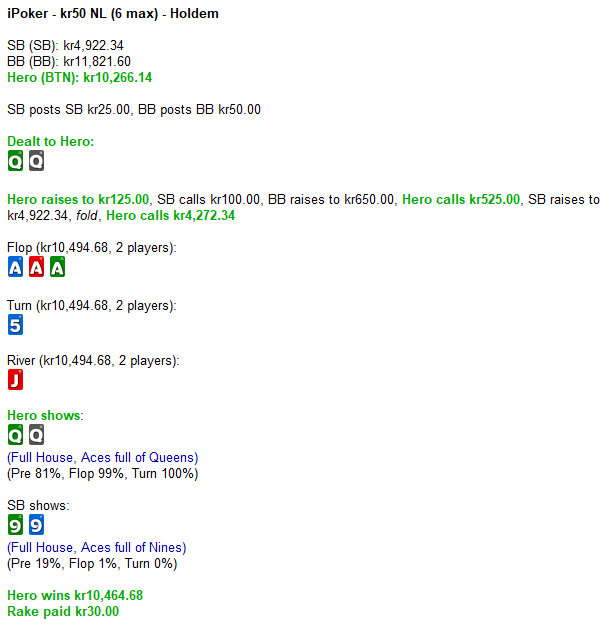 Jag har inga invändningar emot det, Soldado. Tre nya händer från gårdagen, där de två första var ganska tveksamma som spelade, tror jag, medans den tredje var helt okej. Lite synd att de inte delger statistiken i webbelementet. Hand 1. Jag vet inte varför jag c-bettade ut här, men tanken var nog checkcall -> checkraise, eller så hade jag löjlig respekt för 45o, 45s. På turn utesluter jag de få händer som slår mig, de checkar inte på floppen, så min han leder överlägset mot allas range, så det var mest ett fördröjt c-bet i hopp att någon synar. Jag gillar inte mitt riverspel. Villain kommer checka ofta bakom, så ett stort bet är mest rimligt, tror jag. Svenska Spel – NL 0.25/0.50 kr (6 max) – Holdem Spelare: SB: (100 kr) BB: (140.57 kr) UTG (Hero): (93.16 kr) MP: (43.92 kr) CO: (72.14 kr) BTN: (99.78 kr) Posts: SB posts 0.25 kr BB posts 0.50 kr Hålkort: Hero: Preflop: UTG (Hero) : raise 1.50 kr MP : call 1.50 kr CO : call 1.50 kr BTN : call 1.50 kr SB : fold BB : call 1.00 kr Flop (5 players) – Pot: 7.75 kr BB : check UTG (Hero) : check MP : check CO : check BTN : check Turn (5 players) – Pot: 7.75 kr BB : check UTG (Hero) : bet 4.50 kr MP : call 4.50 kr CO : fold BTN : fold BB : fold River (2 players) – Pot: 16.75 kr UTG (Hero) : check MP : bet 10.50 kr UTG (Hero) : raise 87.16 kr MP : all-in 27.42 kr Showdown: UTG (Hero) mucks: MP shows: Result: MP wins 88.89 kr with full house (Fyror fulla med Ess) Rake: 3.70 kr Board: Hand 2. Den första tanken var att spela denna aggressivt, men det blev någon jävla rundgång på floppen, så jag beslöt mig bara för syn - syn. Shove är nog mer rätt istället för synen andra gången, dock bra direkta odds för nötfärgen. Jag har fler 8:or i rangen än BTN och blockar dessutom AA, samt att CO kan blocka QQ. Tacksamt att BTN överraskande checkar på turn. På rivern finns det ingen anledning att inte gå all-in. Svenska Spel – NL 0.25/0.50 kr (6 max) – Holdem Spelare: BTN: (101.75 kr) SB: (100 kr) BB: (130.89 kr) UTG (Hero): (51.89 kr) MP: (92.28 kr) CO: (20.36 kr) Posts: SB posts 0.25 kr BB posts 0.50 kr Hålkort: Hero: Preflop: SB : posts 0.25 kr BB : posts 0.50 kr UTG (Hero) : raise 1.50 kr MP : fold CO : call 1.50 kr BTN : raise 2.50 kr SB : fold BB : fold UTG (Hero) : call 1.00 kr CO : call 1.00 kr Flop (3 players) – Pot: 8.25 kr UTG (Hero) : check CO : bet 1.00 kr BTN : raise 5.62 kr UTG (Hero) : call 5.62 kr CO : all-in 17.86 kr BTN : call 12.24 kr UTG (Hero) : call 12.24 kr Turn (3 players) – Pot: 61.83 kr UTG (Hero) : check BTN : check River (3 players) – Pot: 61.83 kr UTG (Hero) : all-in 31.53 kr BTN : fold Showdown: Hero shows: CO shows: Result: UTG (Hero) wins 59.36 kr with flush (Ess-hög färg) Rake: 2.47 kr Board: Hand 3. Rolig hand att spela, speciellt när man vann den. Betcall på floppen är standard. Jag utesluter JT och i princip AK på turn, därav höjningen. Känslan sa att checkcall var bästa alternativet på river, dock inte övertygad. Svenska Spel – NL 0.25/0.50 kr (6 max) – Holdem Spelare: SB (Hero): (85.29 kr) BB: (39.83 kr) BTN: (114.06 kr) Posts: SB posts 0.25 kr BB posts 0.50 kr Hålkort: Hero: Preflop: BTN : fold SB (Hero) : raise 1.50 kr BB : call 1.00 kr Flop (2 players) – Pot: 3 kr SB (Hero) : bet 2.00 kr BB : raise 4.00 kr SB (Hero) : call 2.00 kr Turn (2 players) – Pot: 11 kr SB (Hero) : check BB : bet 3.00 kr SB (Hero) : raise 12.00 kr BB : call 9.00 kr River (2 players) – Pot: 35 kr SB (Hero) : check BB : all-in 22.33 kr SB (Hero) : call 22.33 kr Showdown: SB (Hero) shows: BB shows: Result: SB (Hero) wins 76.48 kr with two pair (Ess och Damer) Rake: 3.18 kr Board: -