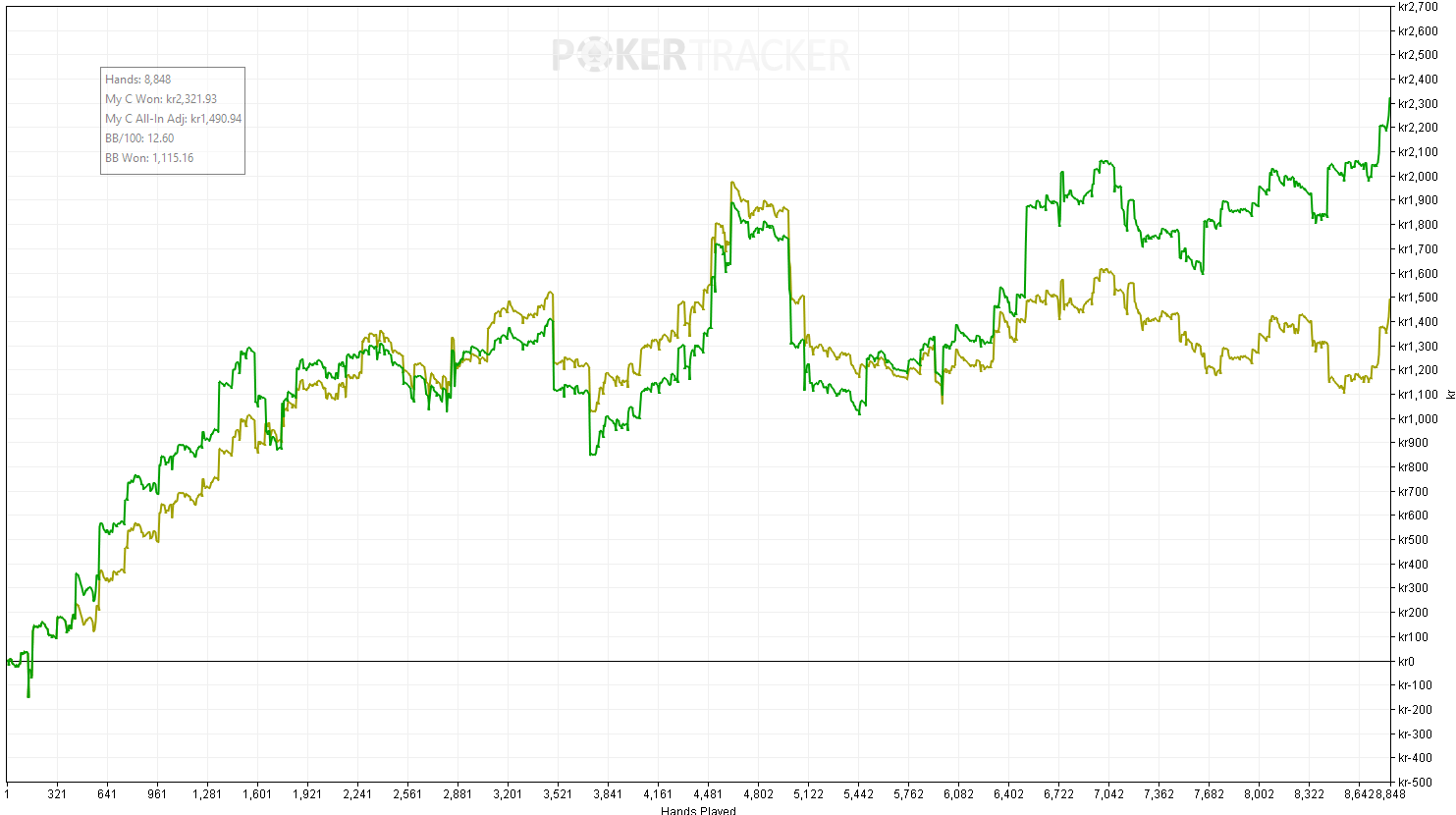 Vecka 16 Bra vecka, spelat årets första golfrunda och gym 3 gånger. Tyvärr en del strul på jobbet vilket känns en del mentalt menmen det löser sig tillslut. En liten fundering, hur tänker ni gällande 100bb vs 200bb. Känns som det måste vara +ev att spela deep mot fiskarna eller tänker jag fel? +429kr En månad spelat nu. Väldigt liten sample men är rätt nöjd: