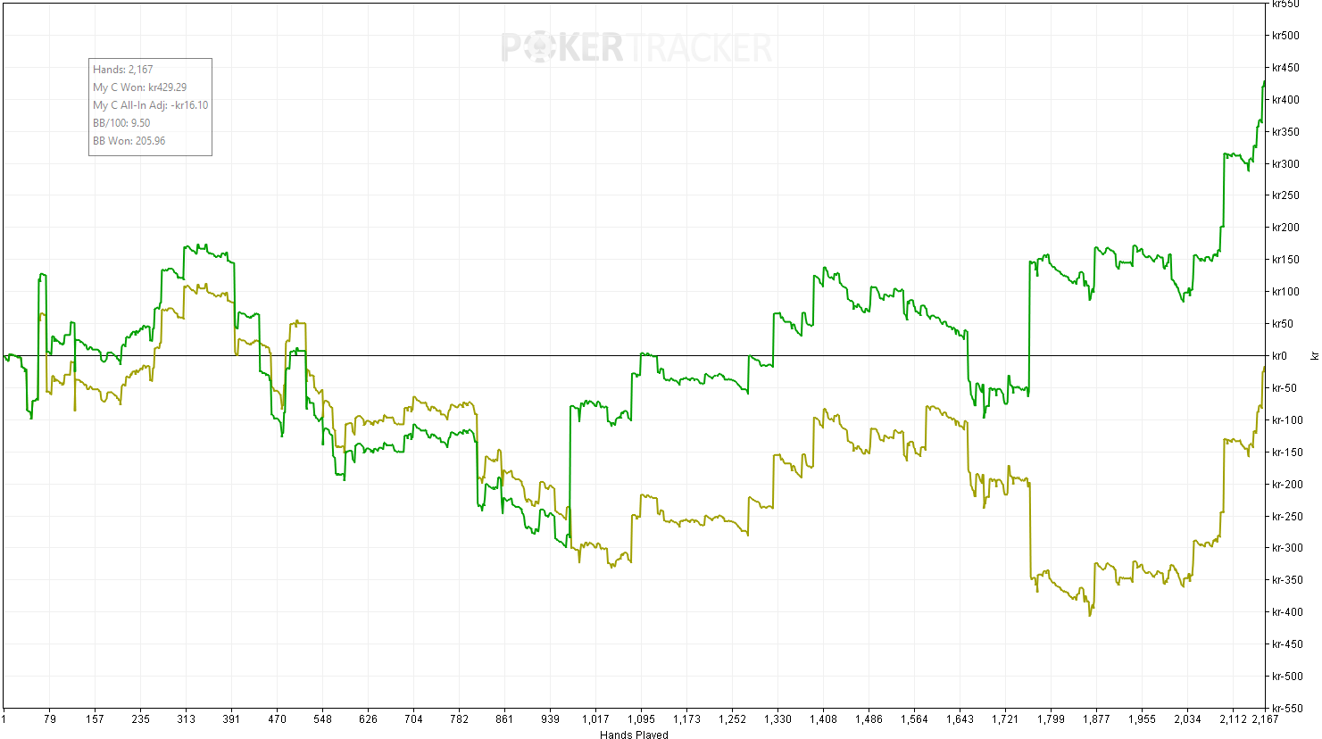 Du gnäller rätt bra på att verkligheten inte matchar dina förväntningar, trots att du vet bättre. Det är väl så man kan tolka det? Det är fel att bara stirra sig blind på 'Net expected BB won'. Den täcker väl ändå inte hela spelet? Du har kanske haft tur i andra delar av spelet som det inte finns statistik på. Dock håller jag med dig om pengarna. Även om de i sig inte är det viktiga kan det ändå vara frustrerande när det enda man egentligen vill är att vinna.