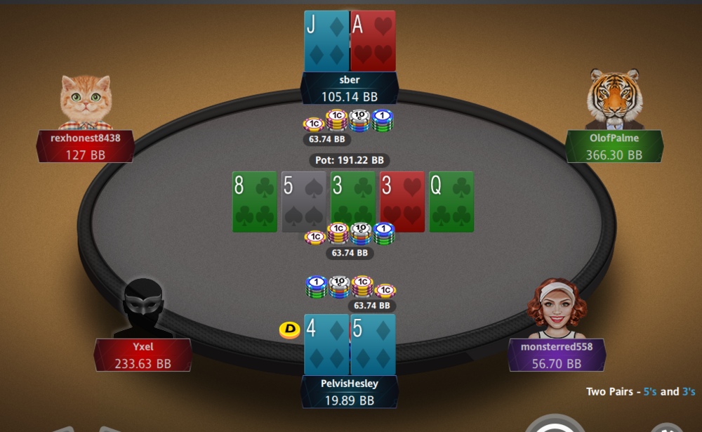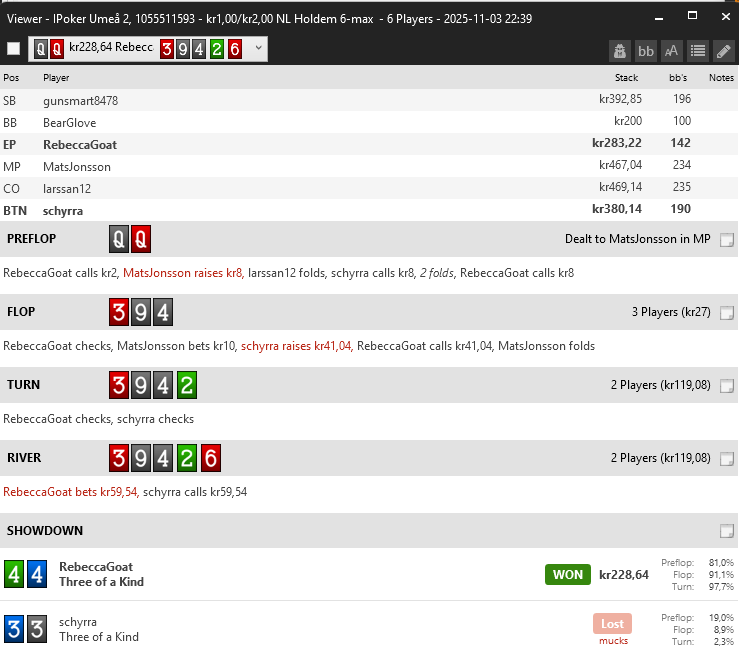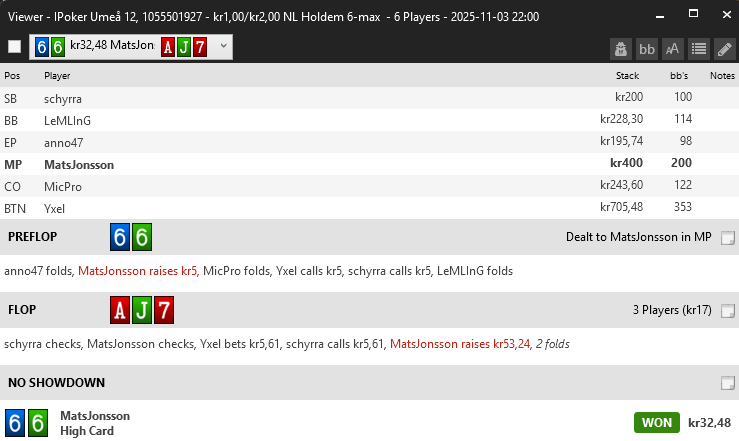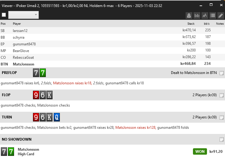 6 man sm Den här handen tog hela min stack... blev 62 i sm och ut med pengar i handen iaf, hade bra flow i turren, 1.8k- 57 svar