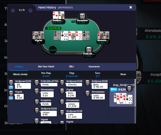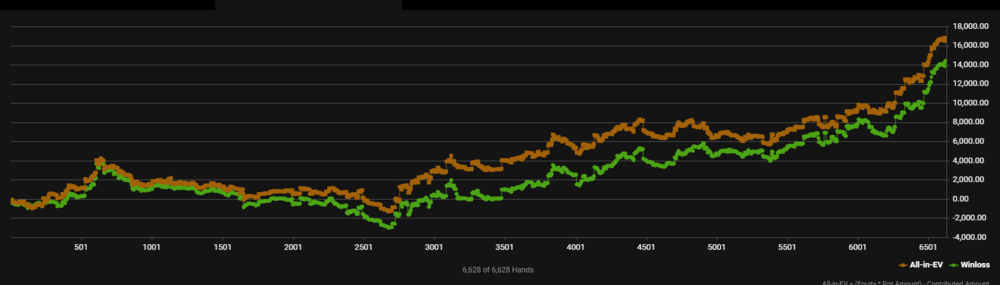 Bra start på 2026, med personlig rekord månad i penga vunna med stor marginal 😃 Profit 45042 dollar Grind 166 timmar Labbtid 13 timmar Gymsessioner 13 Spelat mer multisite grind för att öka average stake blev spel på 4npoker,en clubgg club, tillsammans med wpt (average stake slutade nog med 400-500nl). Men har inte inte längre acces till 4npoker å clubben så blir att lägga till ngn ny sida. (vill inte va ngn som rekar mindre gråzon sidor men jag fick ut pengarna men kmr såklart med sina risker) Största potten för månaden å störa non ante potten jag spelat. (varje dollar på sidan är 0.85 "riktiga dollar") Gick inte att få ner HH från sidan ordentligt men gick Val limp, Jag iso från SB (ska gå betydligt större), BB reg 3b, Val syn, jag syn. Reg cbet, val jam, jag syn, reg syn. Känns lite halv lurigt att posta graf av 6.5k händer speciellt när grafen är resultat pre rake, men första grafen jag har haft på ett tag så blir att posta den =). Sunrungraf 400-1knl med Ante graf på clubgg. På den negativa sidan av månaden så var det för lite studie tid, samt att jag kännde mig väldigt utsliten senaste 3-5 dagarna i grinden å lite för pengarfokuserade å inte tillräkligt nyfiken/strategi fokuserad. Å planen är att ta helt poker ledigt fram till 3e februari ksk den 4e får se hur det känns å sen göra ett schema/plan (postar den här) som är rätt studie fokuserat första halvan av februari för att sedan gå väldigt grind fokuserat mellan 17 februari å 3e mars (kinesiska nyår). Annat mål är att lägga till minst en sida till grinden.