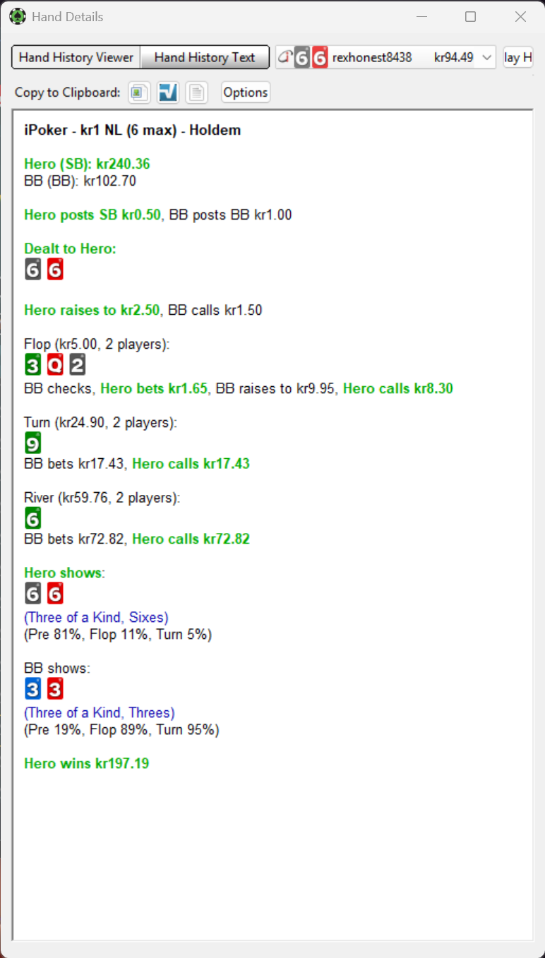 Svenska Spel – NL 0.25/0.50 kr (6 max) – Holdem Spelare: SB: (99.50 kr) BB: (10.85 kr) UTG: (237.19 kr) MP: (118.17 kr) CO (Hero): (84.96 kr) BTN: (98.75 kr) Posts: SB posts 0.25 kr BB posts 0.50 kr Hålkort: Hero: Preflop: UTG : call 0.50 kr MP : fold CO (Hero) : raise 2.00 kr BTN : fold SB : fold BB : call 1.50 kr UTG : raise 6.00 kr CO (Hero) : call 4.00 kr BB : raise 10.00 kr UTG : call 4.00 kr CO (Hero) : all-in 84.96 kr BB : all-in 0.85 kr UTG : call 74.96 kr Flop (3 players) – Pot: 181.01 kr Turn (3 players) – Pot: 181.01 kr River (3 players) – Pot: 181.01 kr Showdown: BB shows: UTG shows: CO (Hero) mucks: Result: UTG wins 176.02 kr with Två par, tior och femmor Rake: 5 kr Board: Av någon jävla anledning förlorar jag alla sådana här på /0,50, minst 3 stycken igår, där jag var favorit att vinna handen. Villains limp/raise/call/call är väl inte av denna värld, vilket gjorde att jag pushade löst. Han steksynade, lite senare i chatten skrev han att han var 'oläsbar'. -