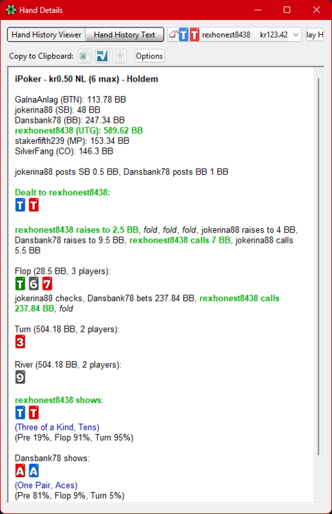 Dinousarien Postad 27 Augusti , 2024 Rapport Postad 27 Augusti , 2024 5 timmar sedan, säger kukbajs : Spelade väl fan inte /20? Kommer nog ej spela eller uppdatera på ett tag. Kyss kyss Du satt in med 800kr sen autotoppade klienten dig handen efter till 100bb, men du klev efter 5 händer som tur väl typ +/- 0! Citera