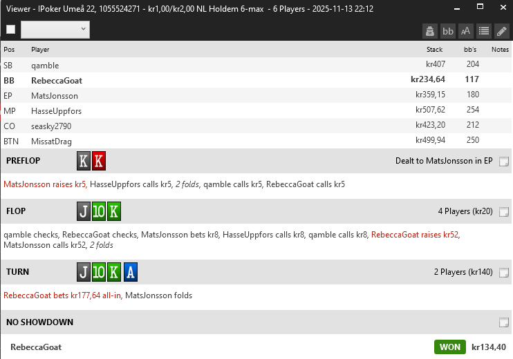 Pre Flop: (pot: SEK3.00) Hero has Kheart4.gif Kdiamond4.gif